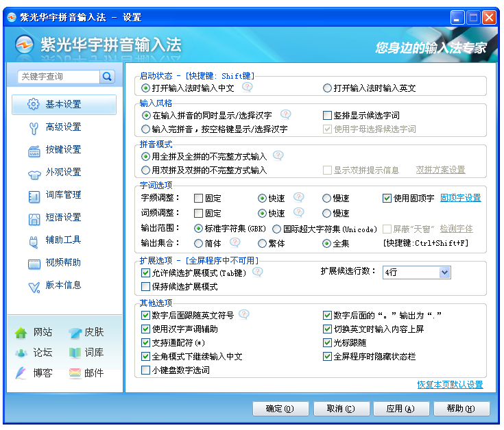 输入法的一切用户习惯、输入方式、外观皮肤、词库都可以通过设置面板来设定。