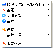 在状态条窗口中,点击鼠标右键弹出“输入法系统菜单”。菜单中的功能项包括软键盘选择、主题选择、快速设置、输入法帮助、设置属性、辅助工具和输入法版本信息。