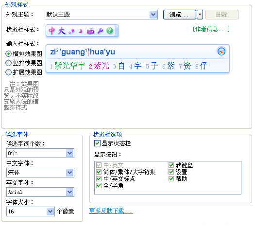 选择您喜欢的主题使用,点击下拉框可以选择输入法自带的主题,点击[浏览]可以加载自制的主题。您也可以在输入法状态条上点击右键,在弹出的菜单中选择主题。